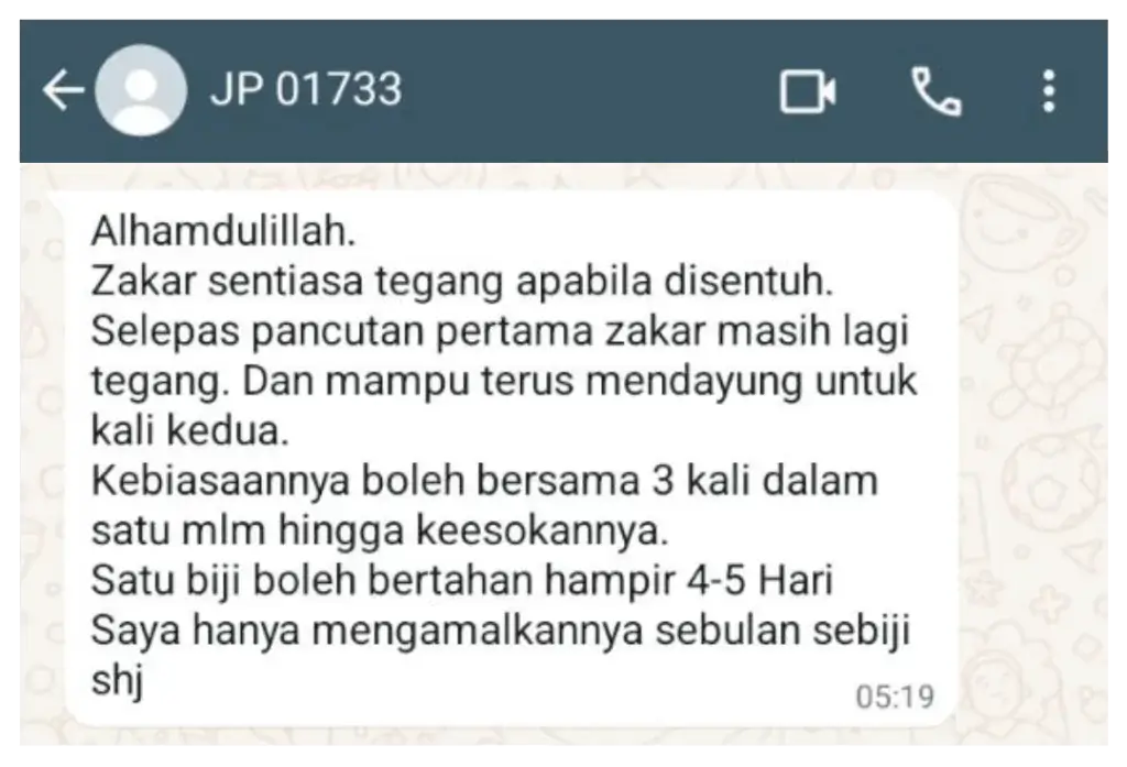 Jangan risau, caranya cukup mudah. Jamu hanya perlu makan sebiji sahaja setiap 4 ke 5 hari.Tak boleh makan hari-hari. Krim pula cuma perlu sapu di bahagian sensitif di sekitar zakar dan biarkan selama sekurang-kurangnya sejam sebelum bersama.Tak perlukan apa-apa urutan.